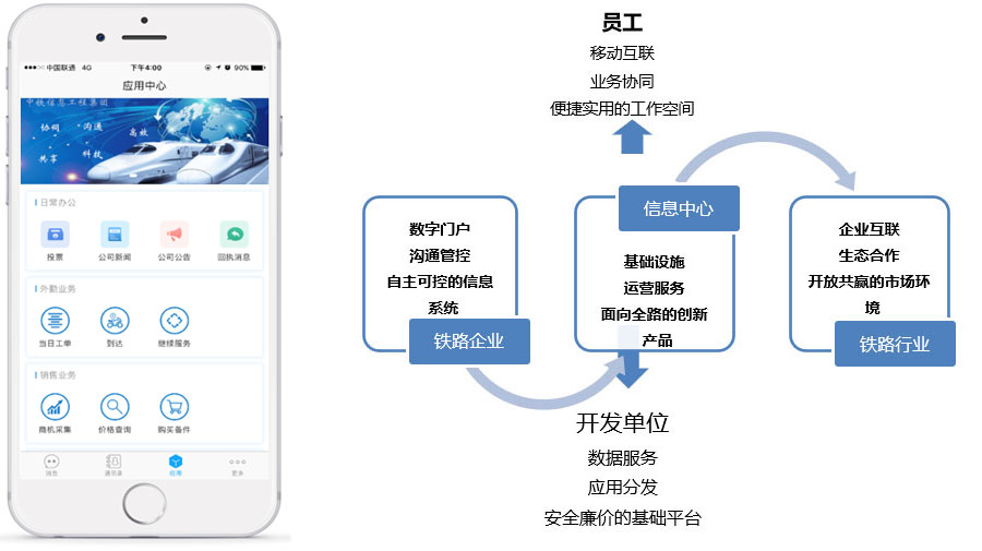 ● 整合信息公司軟件、硬件和網絡資源 ● 應用移動信息化技術,優化完善移動應用研發、部署、運維、管理的基礎設施服務 ● 為全路企業、職工提供統一移動APP和移動化業務平臺 ● 滿足鐵路企業業務應用移動化需求